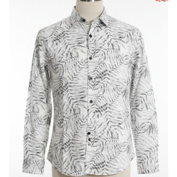 This shirt appears to be made of cotton with a crisp texture. It's primarily white, adorned with a bold, repeating pattern of grey palm leaves. It features long sleeves and a classic collar. The shirt has black buttons running down the front. Available at Gangavathiexports with exceptional quality and unbeatable pricing.