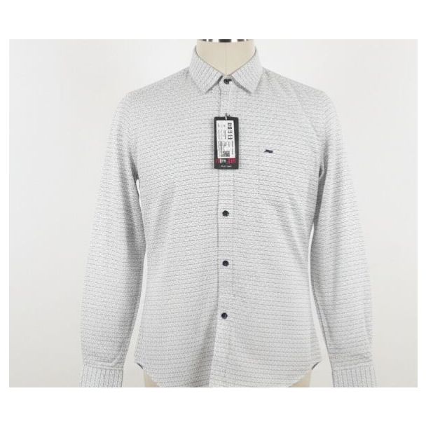This shirt appears to be made from a cotton blend, presenting a subtle textured feel. The color is primarily white with a micro-print in light grey. It features a classic collar and long sleeves with buttoned cuffs. The fit appears to be a tailored silhouette, perfect for a smart casual look. Available at Gangavathiexports with exceptional quality and unbeatable pricing.