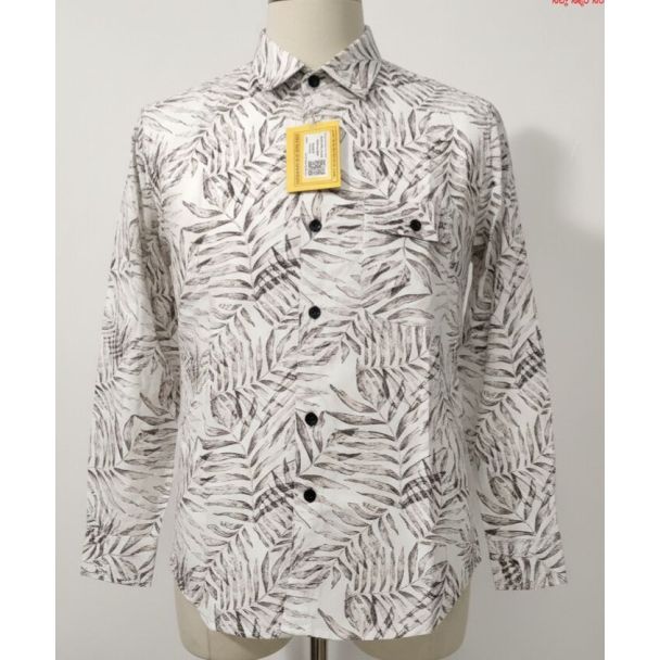 This shirt features a light, likely cotton fabric with a white background and an allover pattern of dark gray leaf prints. It has a classic collar, and long sleeves with buttoned cuffs. The fit appears to be a standard, relaxed fit. The shirt is fastened with black buttons. Available at Gangavathiexports with exceptional quality and unbeatable pricing.