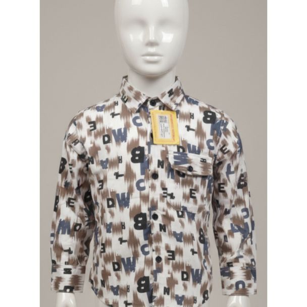 Introducing a fun and fashionable white cotton shirt designed for young boys. This shirt features a captivating all-over print of letters in shades of brown and dark blue, creating a unique and eye-catching design. Perfect for casual outings and everyday wear, it combines comfort with playful style.