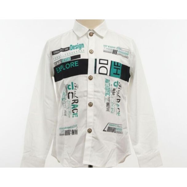 Crisp white cotton shirt featuring bold typographic graphics in black and teal, designed with a structured collar and full sleeves.