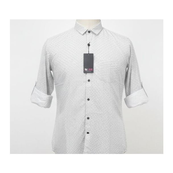This shirt appears to be made from a smooth cotton fabric. The primary color is white, patterned with tiny, scattered dark grey dots. It has a classic collar and long sleeves. This shirt is tailored for a slim fit. Available with exceptional quality and unbeatable pricing at Gangavathiexports.