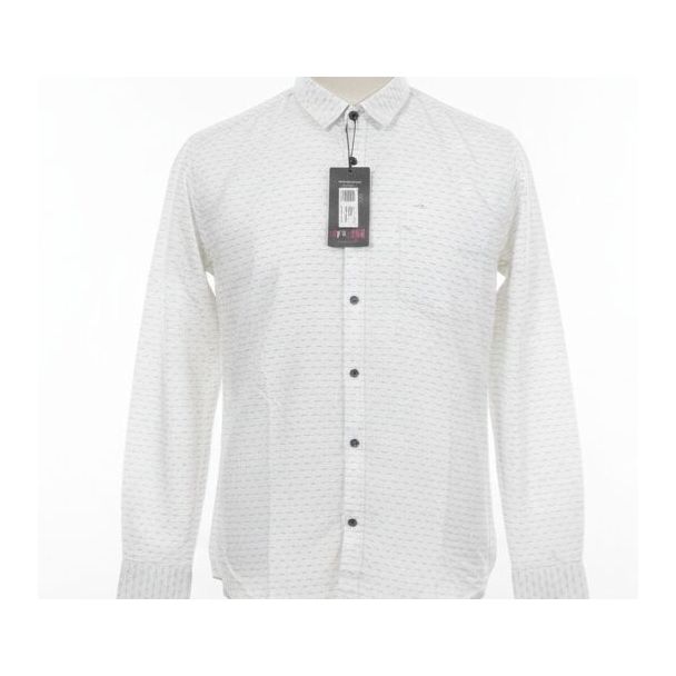 Crisp white cotton full sleeve shirt featuring a subtle micro-dash pattern and a classic pointed collar.