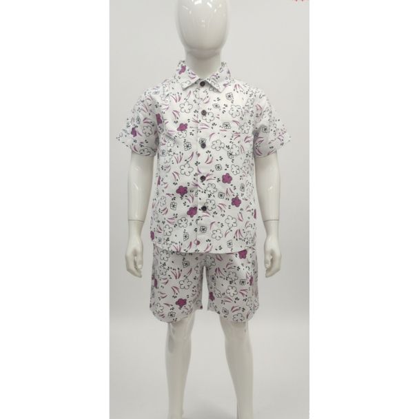 Presenting this essential budget-friendly two-piece set, perfect for young boys needing comfortable and stylish warm-weather attire. This coordinating shirt and shorts ensemble features a crisp white base adorned with a charming, dense print, ensuring your child stays cool and looks great during casual outings or playdates.