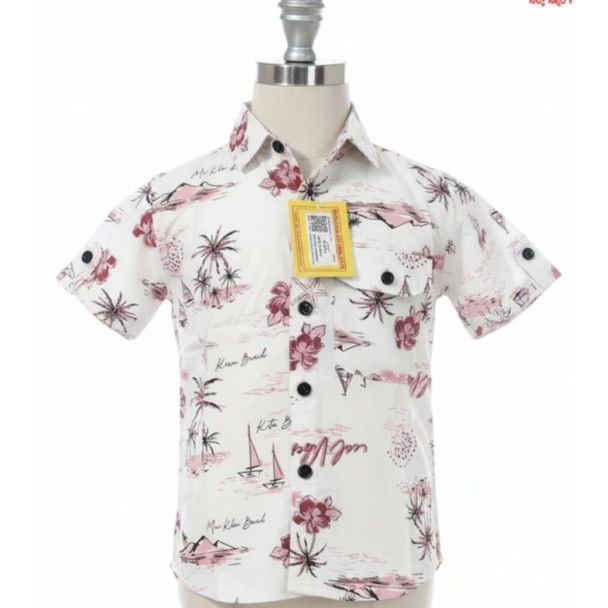 This shirt appears to be made of cotton with a crisp texture. It's a pristine white, adorned with a tropical scene print. The pattern includes pink and dark red flowers, palm trees, and coastal elements. The shirt features a classic collar and short sleeves. This shirt is perfect for a casual day Available at Gangavathiexports with exceptional quality and unbeatable pricing.