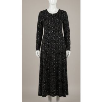 Black Dotted Cotton A-Line Midi Dress Long Sleeve