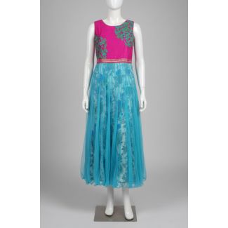 Fuchsia Embroidered Aqua Net Sleeveless Round Neck Gown