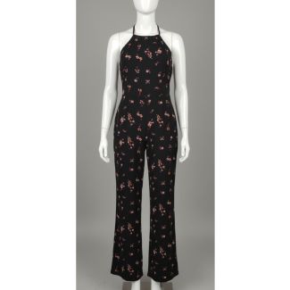 2. Black floral print halter neck jumpsuit displayed on a white mannequin front view India