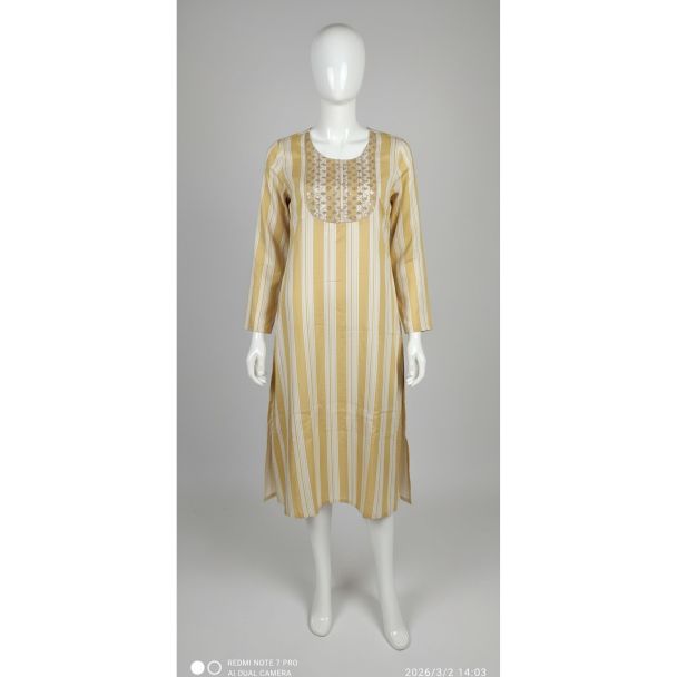 Elevate your everyday ethnic style with this stunning yellow and cream striped cotton kurti. Designed for the modern woman seeking comfort and style in her daily wardrobe, this piece offers a relaxed yet chic silhouette perfect for casual outings or work environments across India.